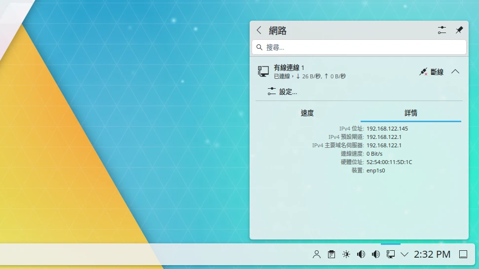 點選KDE右下角的網路連線取得Linux的IP,這裡的範例是區域IP
