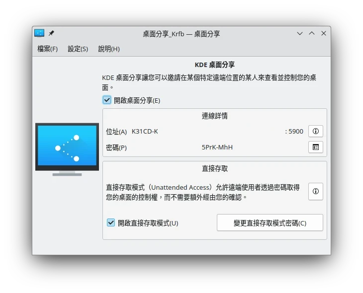 開啟「Krfb桌面分享」。設定簡單明瞭,將兩個選單都打勾,設定密碼,就會啟動桌面分享。