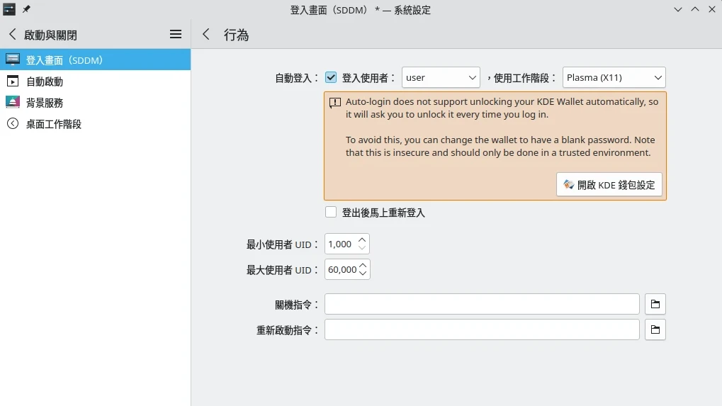 如果要將Krfb設定為開機自動啟動的話,建議使用X11工作階段(因為Wayland得手動同意遠端連線),然後到KDE系統設定,開啟開機後自動登入帳號(因為SDDM登入畫面無法啟動Krfb)