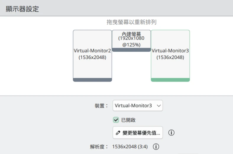 如下圖,建立二個虛擬顯示器,讓另外兩台電腦連接,這樣我就擁有了三個螢幕啦!