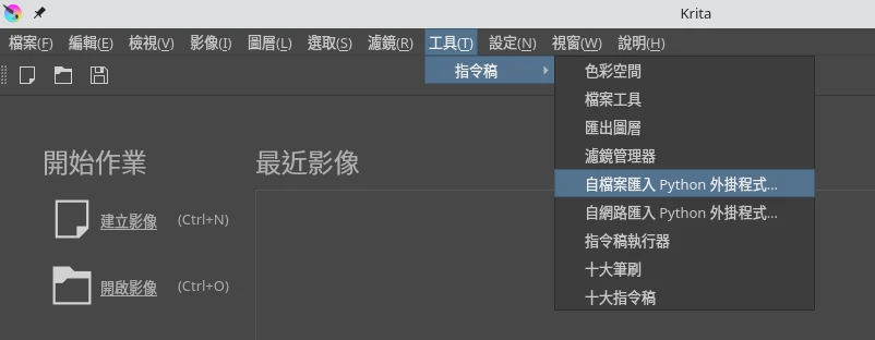 開啟Krita,點選工具 → 指令稿 → 自檔案匯入Python外掛程式,選取剛剛下載的zip檔。