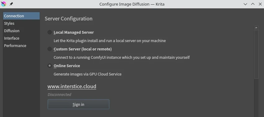 此處介紹三種設定方式,使用開發者提供的Interstice雲端運算服務應該是最簡單的作法。不過如果你已經會用ComfyUI,那麼連接到自架的ComfyUI伺服器也是可以的。