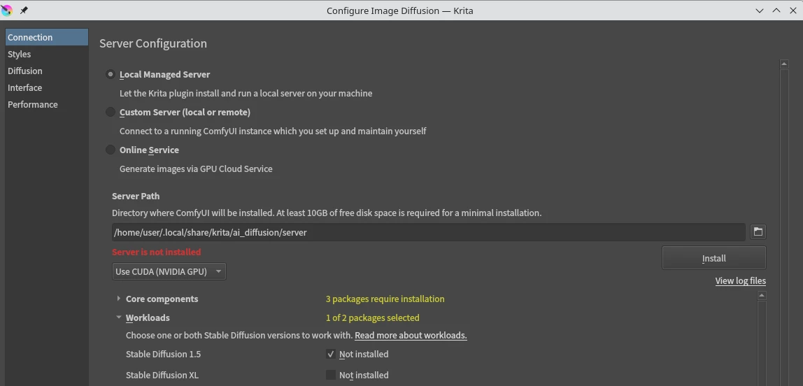 Local Managed Server選項是讓Krtia Diffusion幫你自動裝好ComfyUI以及相應的擴充功能。約會佔用10GB左右硬碟空間。