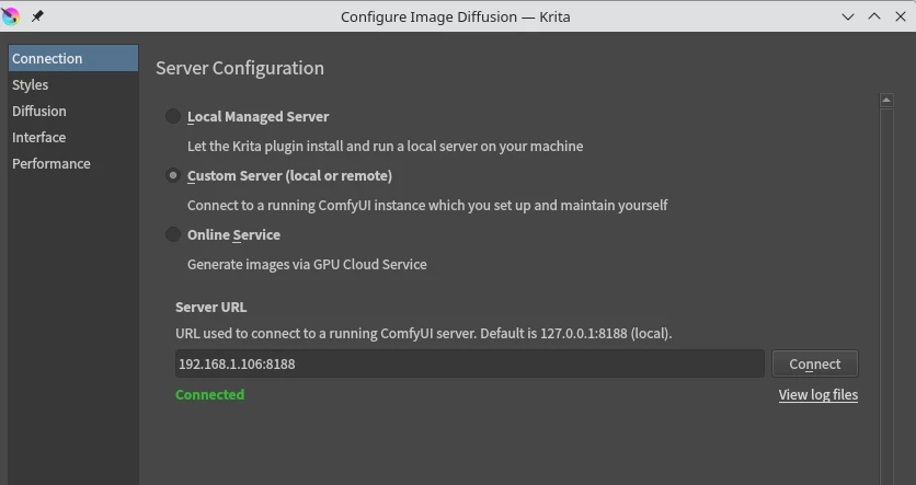 設定好之後請在Connection頁面,點選Custom Server,並輸入ComfyUI伺服器的IP,確認綠字Connected才算成功。