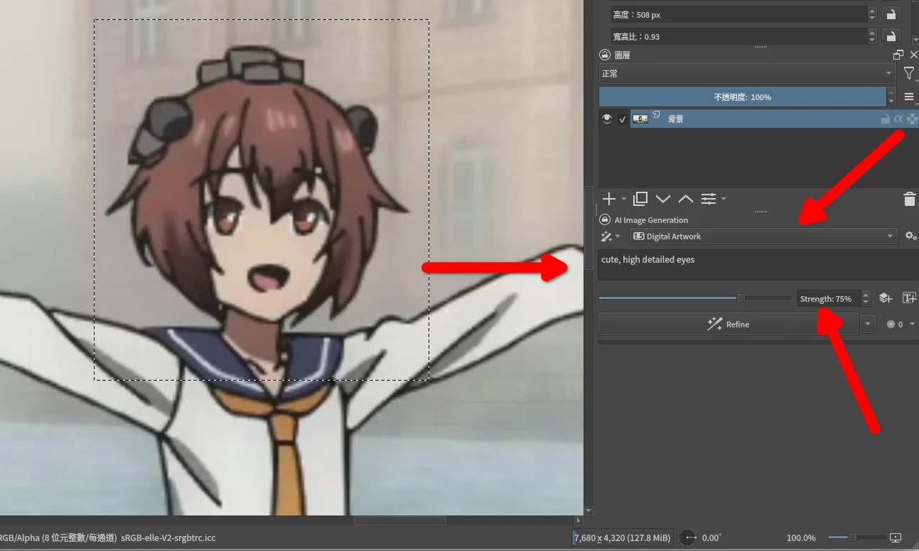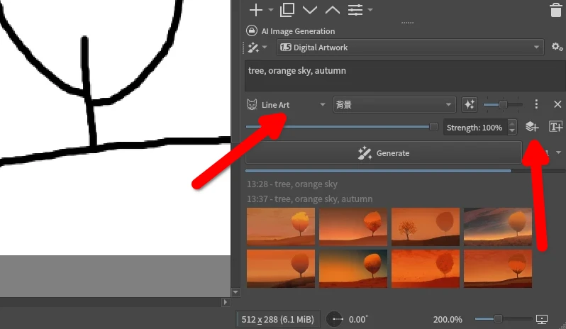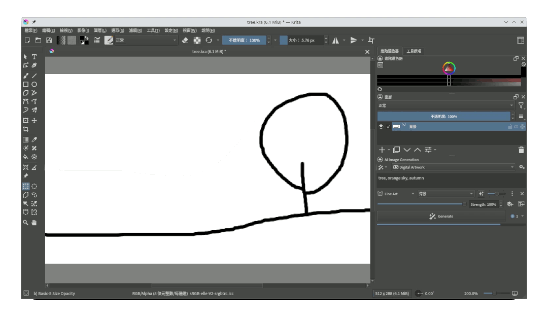 再於Krita AI的面板,切換到Generate頁面,選取風格設定檔,填入提示詞,設定要生成的內容。下方的強度(Strength)為參考原圖的程度,數值越高,AI生成的內容與原圖越不相關。