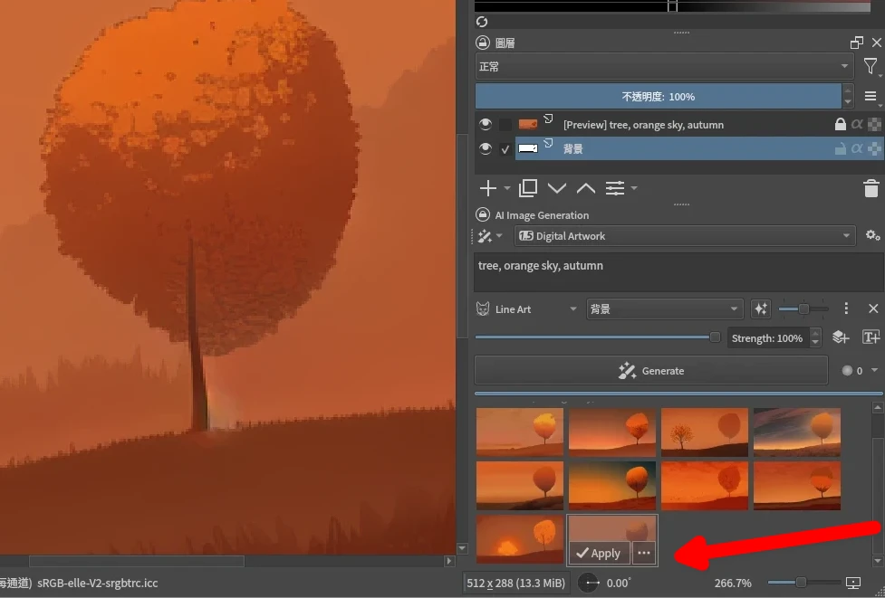 輸入提示詞,點選生成。選取喜歡的結果,再按下套用。