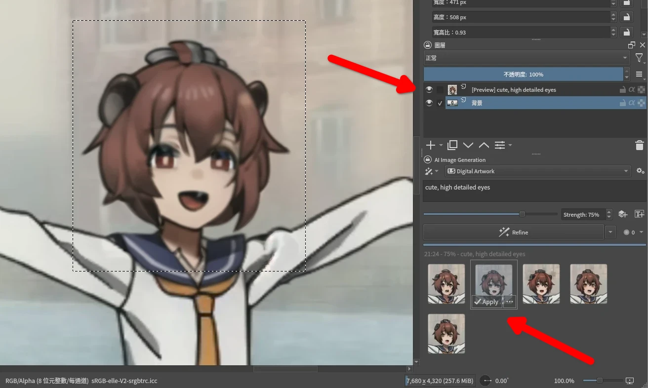 點Generate或Refine按鈕,等待ComfyUI計算完成,就會出現AI生成的圖層了。剛生成的圖片是預覽(Preview)狀態,你需要按套用(Apply)該圖層才可繼續編輯。