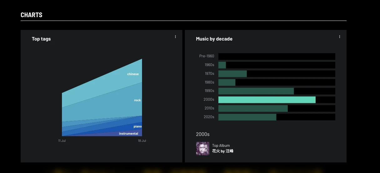 - Reports頁面進入詳細的分析模式,讓你了解你喜歡的歌曲是哪些類型的?大部份屬於幾零年代的?