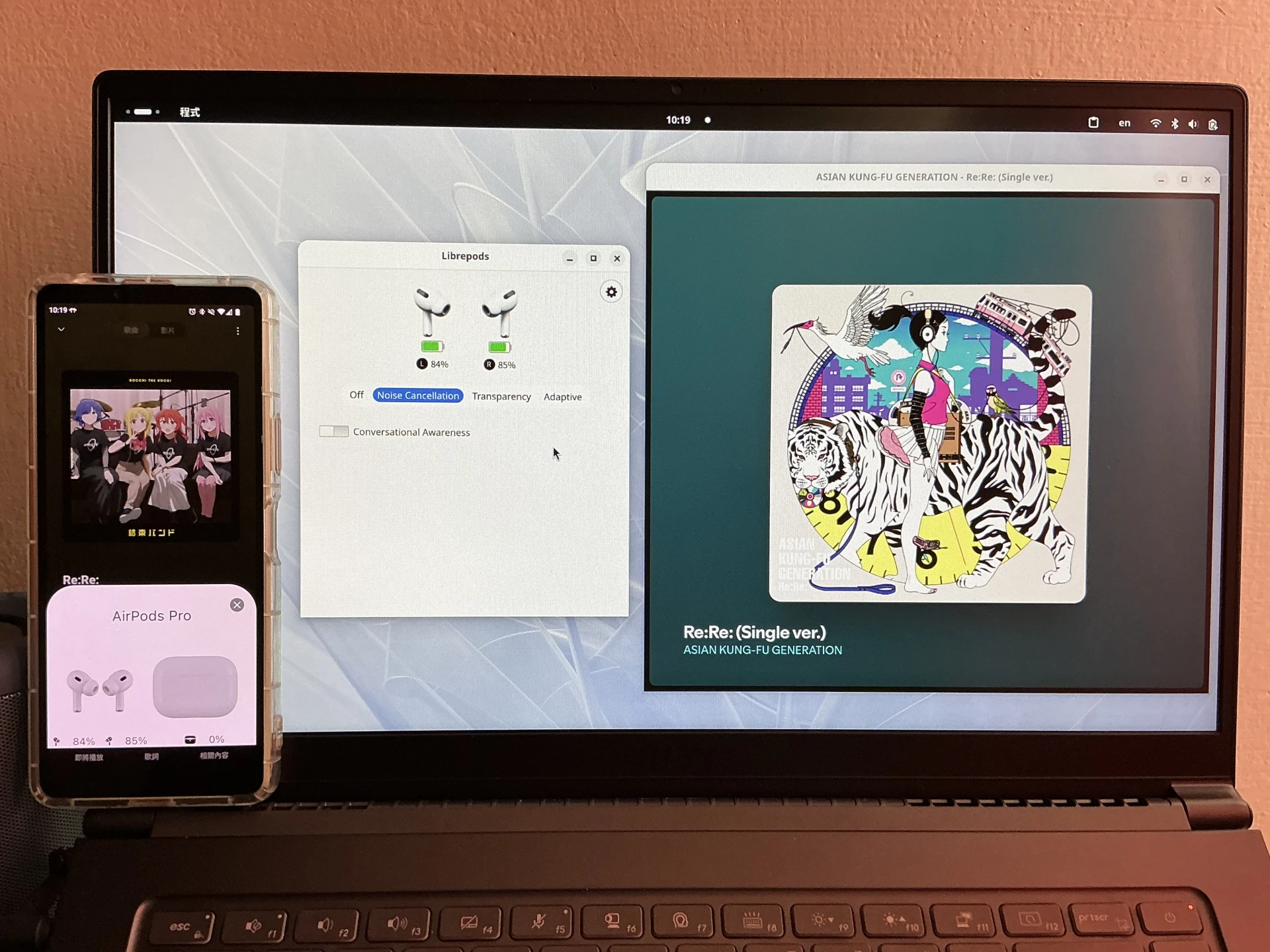 如下圖,在Linux電腦Android與手機間切換AirPods連線,手機會跳出AirPods打開的動畫。這裡播放的是結束バンド和ASIAN KUNG-FU GENERATION,兩個樂團版本的〈Re:Re:〉