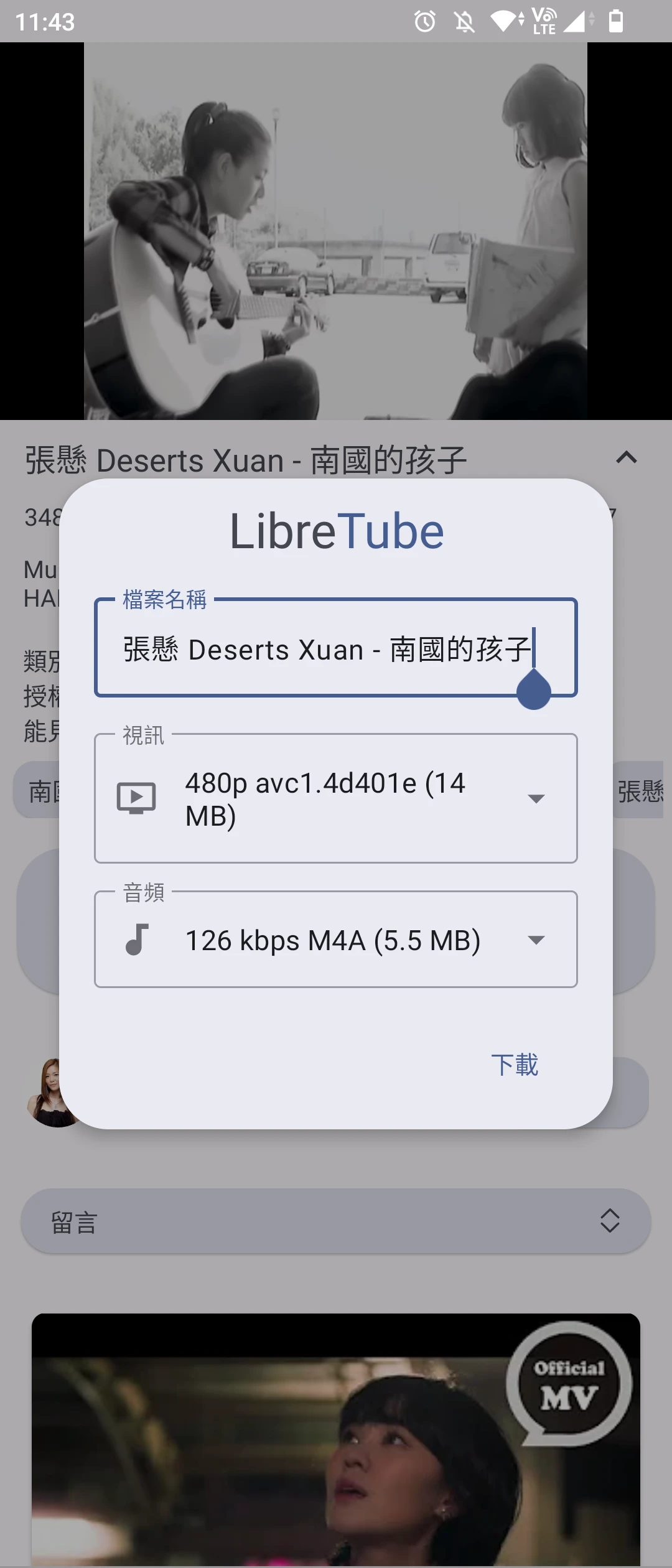 下載影片需選擇影片畫質和音訊品質,LibreTube會自動合併二者。預設儲存位置為