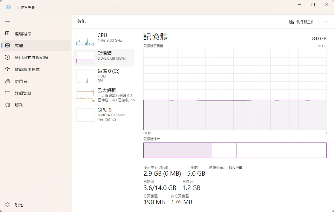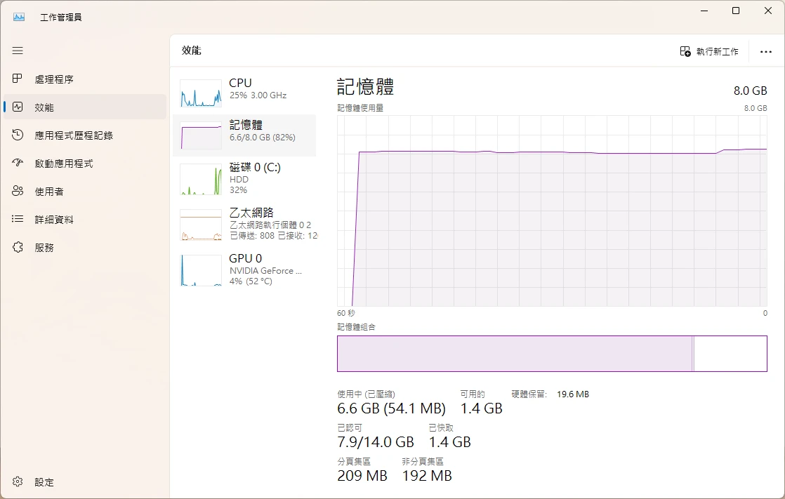 而現在只有4GB RAM可用,所以Widnows服務的佔用來到了82%。