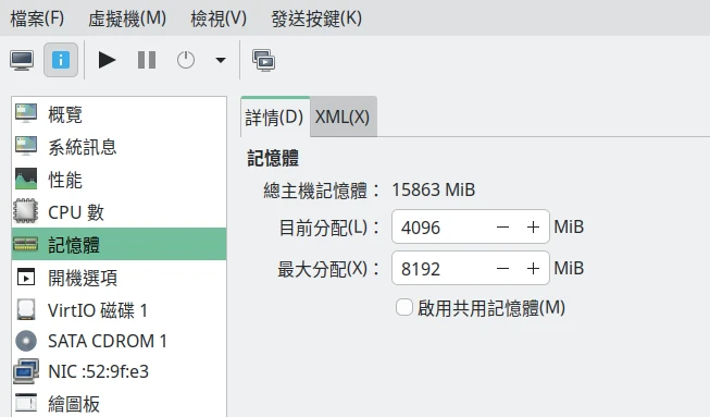 雖然Virt Manager的界面可以設定目前要分配多少RAM給虛擬機,但虛擬機必須先關機才能調整。