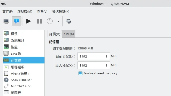 編輯虛擬機硬體,在分配記憶體的選單,點選啟用共享記憶體(Enable Shared Memory),讓虛擬機與宿主機共享一部分RAM。