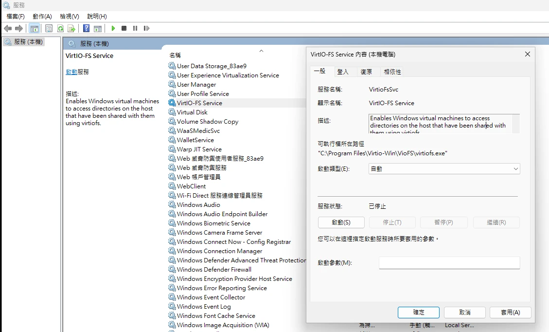 搜尋並開啟Windows「服務」視窗,設定開機自動啟動VirtIO-FS Service (VirtoFsSvc)。再點選啟動。