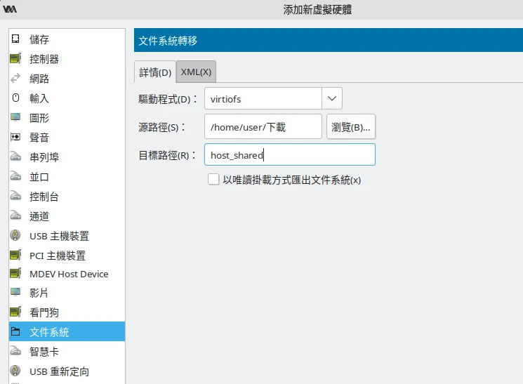 點選新增硬體 → 檔案系統,驅動程式選virtios-fs,源路徑選取要分享的Linux目錄(例如