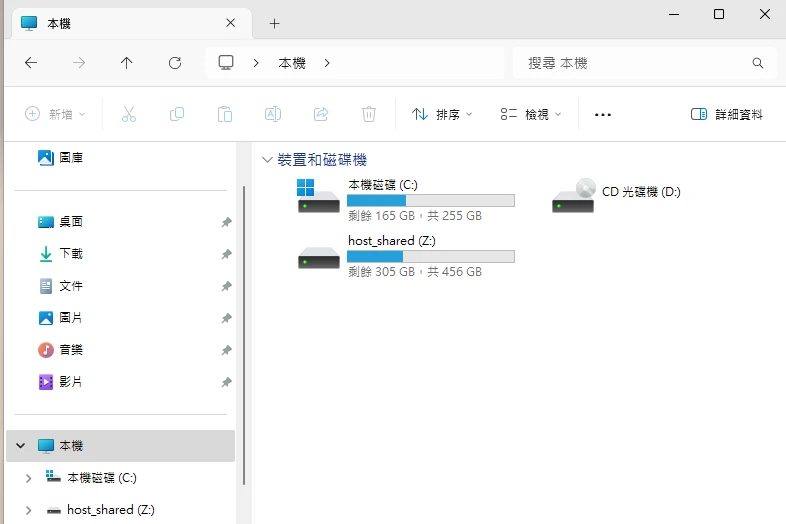 這樣virtio-fs共享的資料夾應該就會出現在檔案總管的磁碟列表了,預設自動掛載在Z槽。