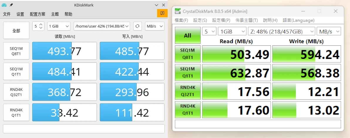 下面是「Linux宿主機KDiskMark讀取硬碟速度」與「Windows虛擬機Crystaldiskmark透過VirtIO-FS讀取硬碟速度」的比較。