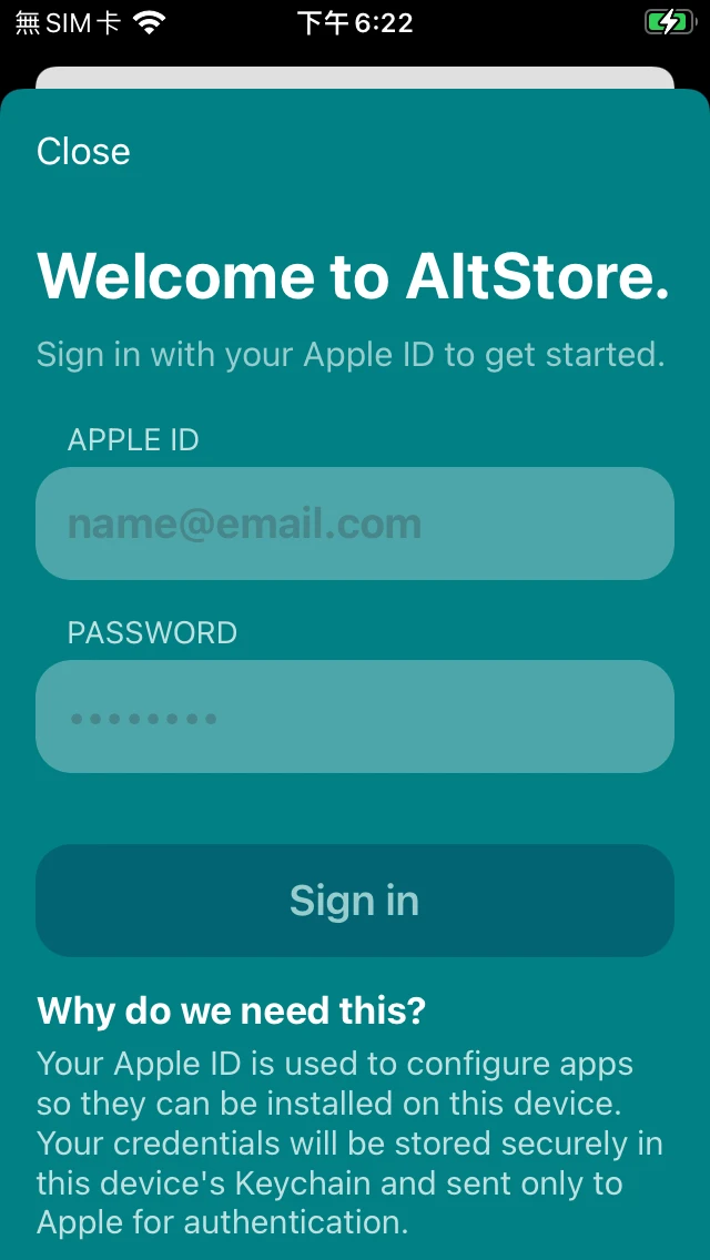 之後開啟AltStore APP,點右下角Settings登入Apple ID。