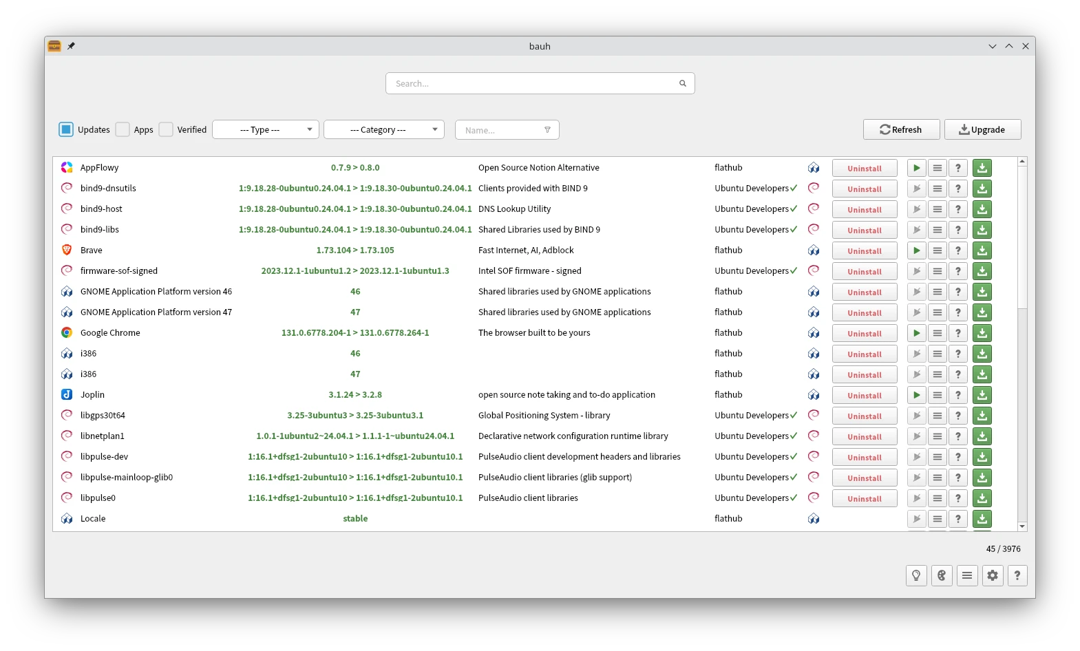 支援管理APT(.deb)、Pacman、Flatpak、Snap、AppImage等格式的應用程式。bauh有點像是Synaptic + Pamac的合體。