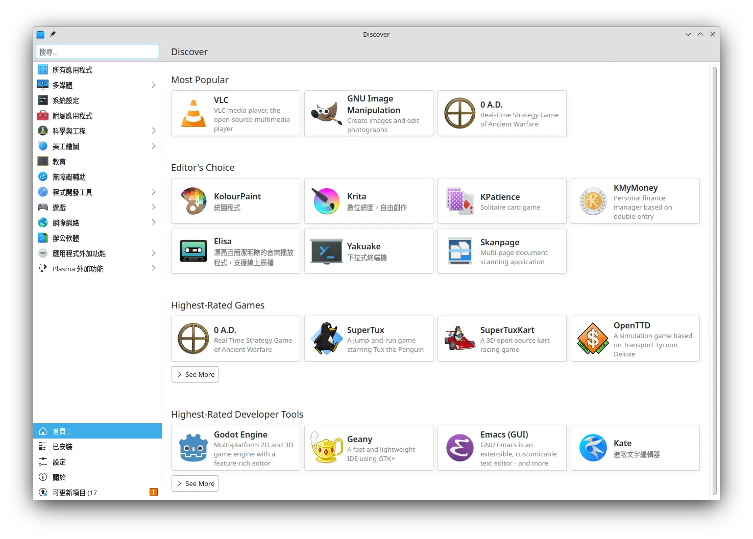 於是安裝Linux的桌面應用程式不需要完全靠指令了,也就不用費心查詢各發行版的某某軟體套件叫什麼名字。