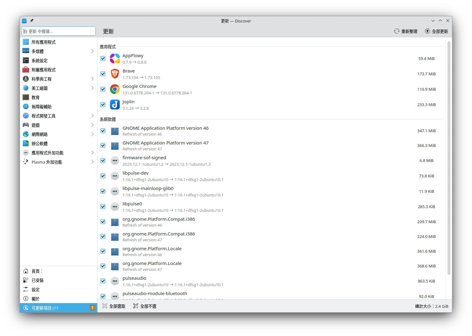 安裝KDE Discover之後,也會自動檢查軟體更新。它會透過PackageKit執行apt update指令,更新系統軟體。