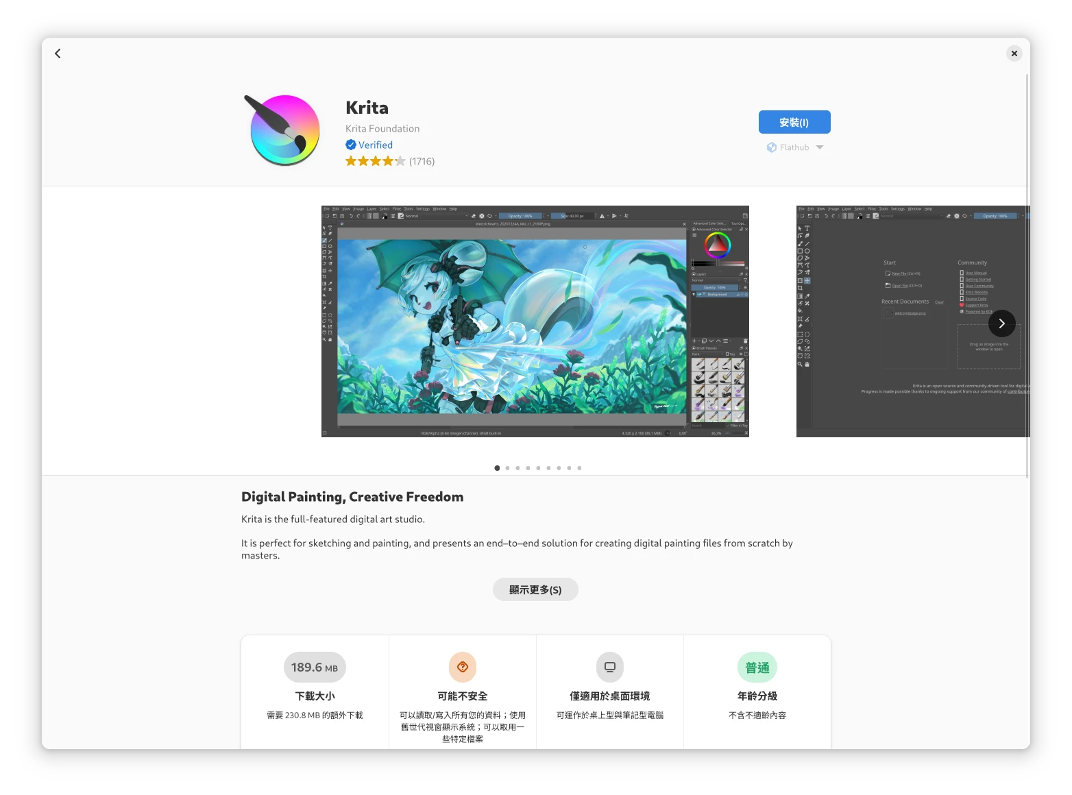 搜尋,點進去會看到應用程式資訊。右上角會顯示應用程式來源。下方有應用程式分級,還會顯示權限、使用者評分等資訊。如果有的話,會顯示Flatpak與Snap的應用程式來源。