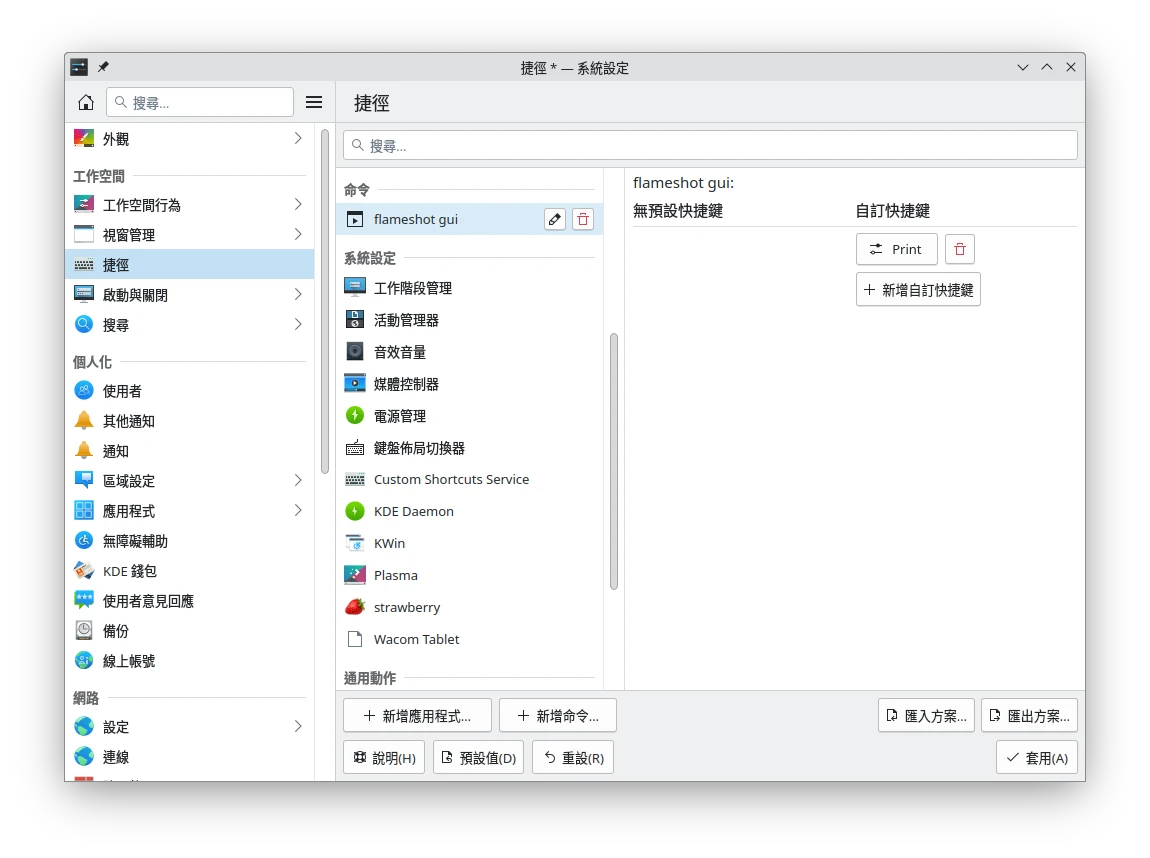 KDE Plasma:KDE系統設定 → 捷徑 → 新增指令flameshot gui,再綁定「PrtSc」快捷鍵,取代原本的Spectacle。