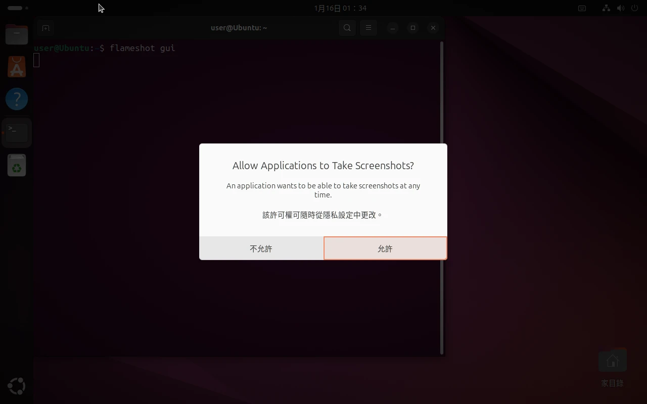 點一下Flameshot圖示,啟動截圖。GNOME Wayland可能會詢問是否允許程式截圖,點選「是」。若GNOME Wayland無法截圖請改用命令行啟動(見下)。