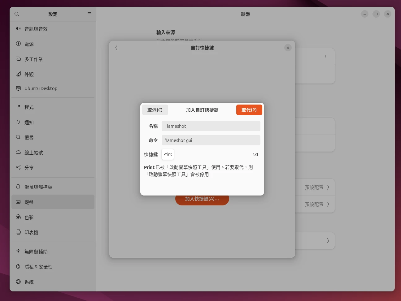 - 如果你希望能夠按「PrtSc」鍵就啟動Flameshot截圖,那麼你得調整桌面環境的全域快捷鍵,將「PrtSc」鍵盤綁定為執行