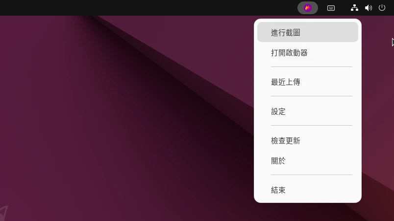 點一下應用程式列表的Flameshot,程式啟動後會自動縮小到系統匣,GNOME在左上角,KDE Plasma則是在右下角。若你的GNOME沒有系統匣請安裝Tray Icons擴充套件。