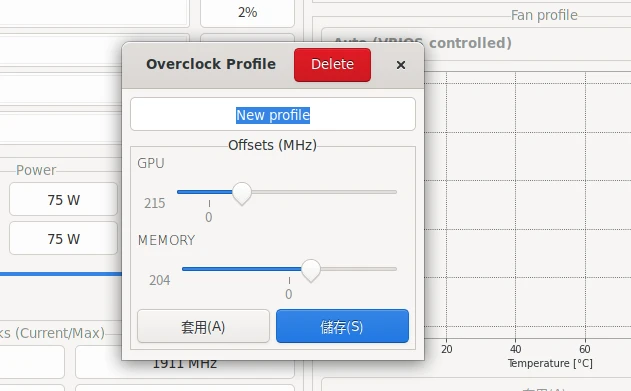 - 又,Flatpak的Gamemode無法修改系統設定,我不啟用Gamemode的超頻設定,改用另一款超頻工具GreenWithEnvy來達到目的。GreenWithEnvy的面板下方可以設定要超頻的時脈和記憶體數值(Linux無法超電壓),建議先小幅度超一點點,我Nvidia GTX1050Ti超到500MHz以上就會黑螢幕了。