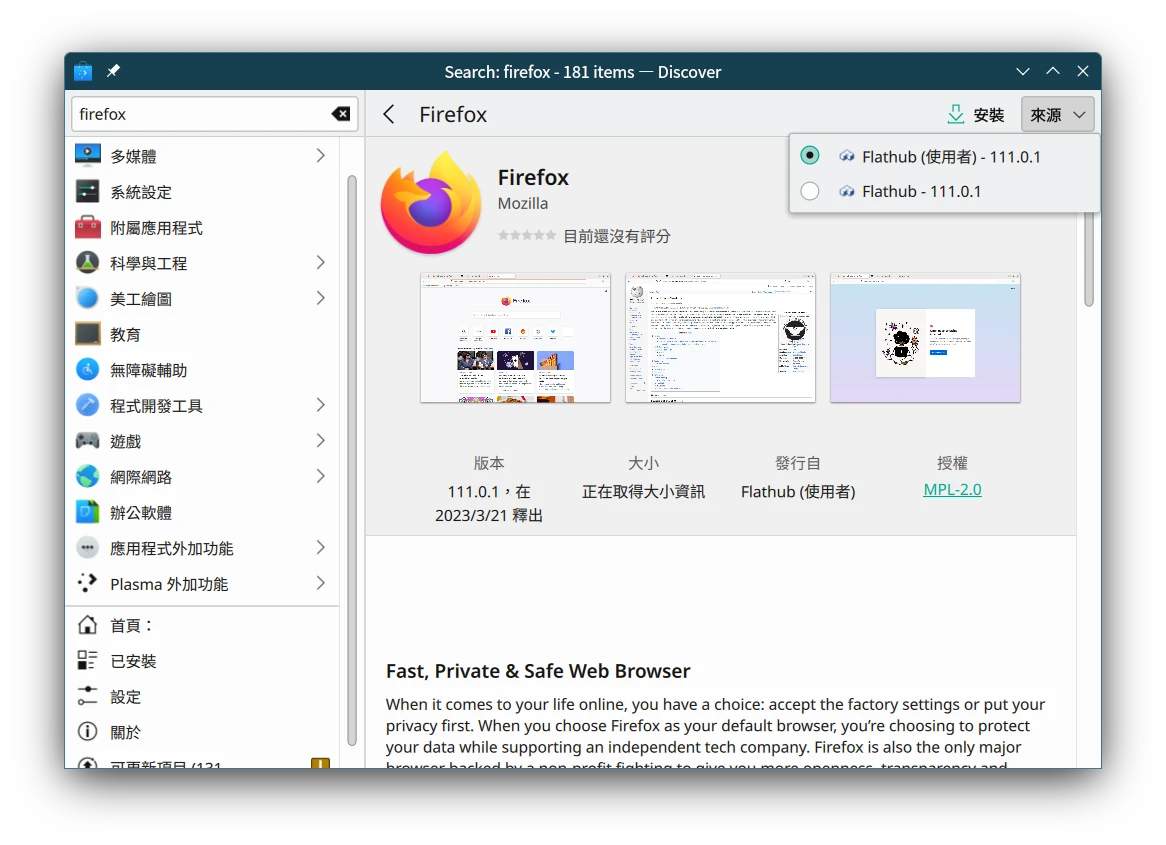 在應用商店瀏覽的時候應會顯示「Flathub來源」,如下圖KDE Discover的畫面。