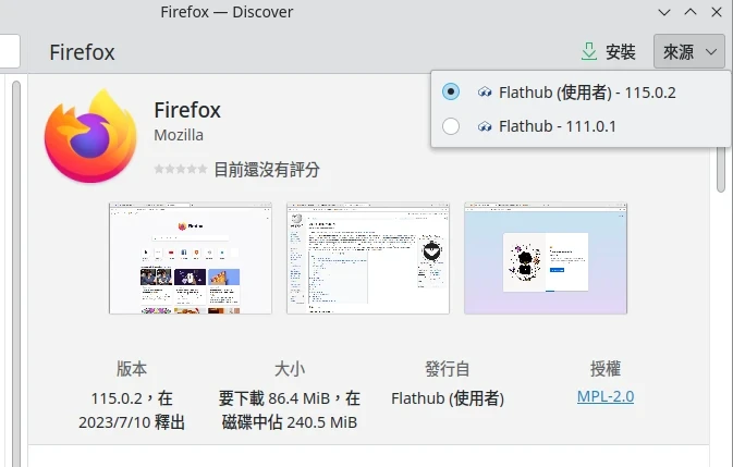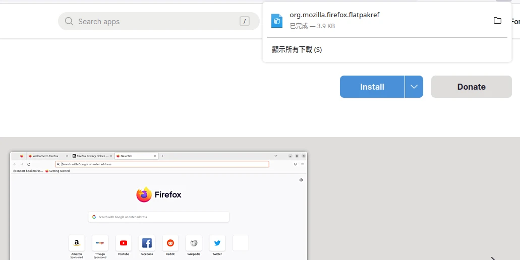 以Flathub的Mozilla Firefox為例,點選"Install"會下載