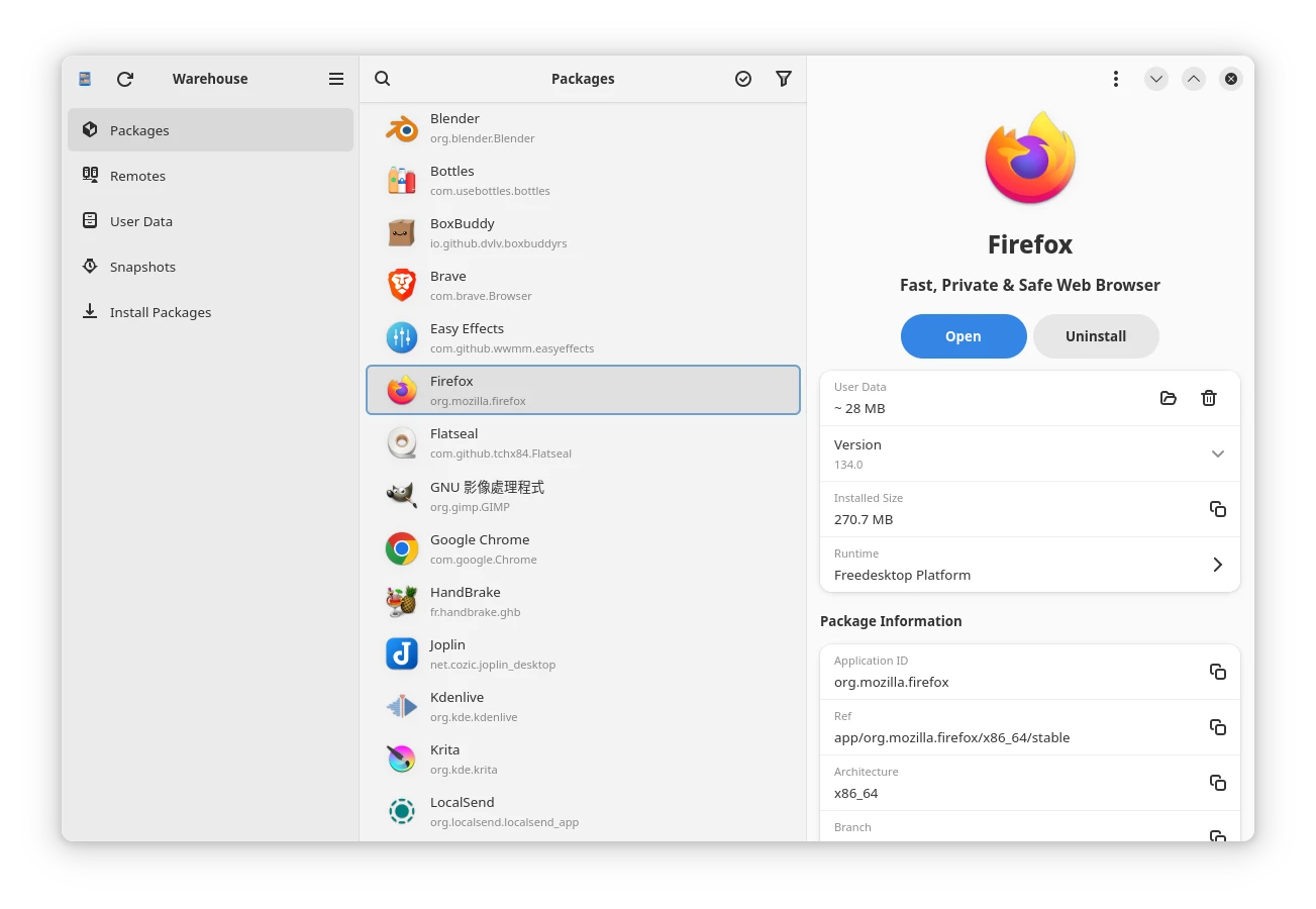 - 做完以上措施後,重開機後就能用Flatpak安裝軟體。