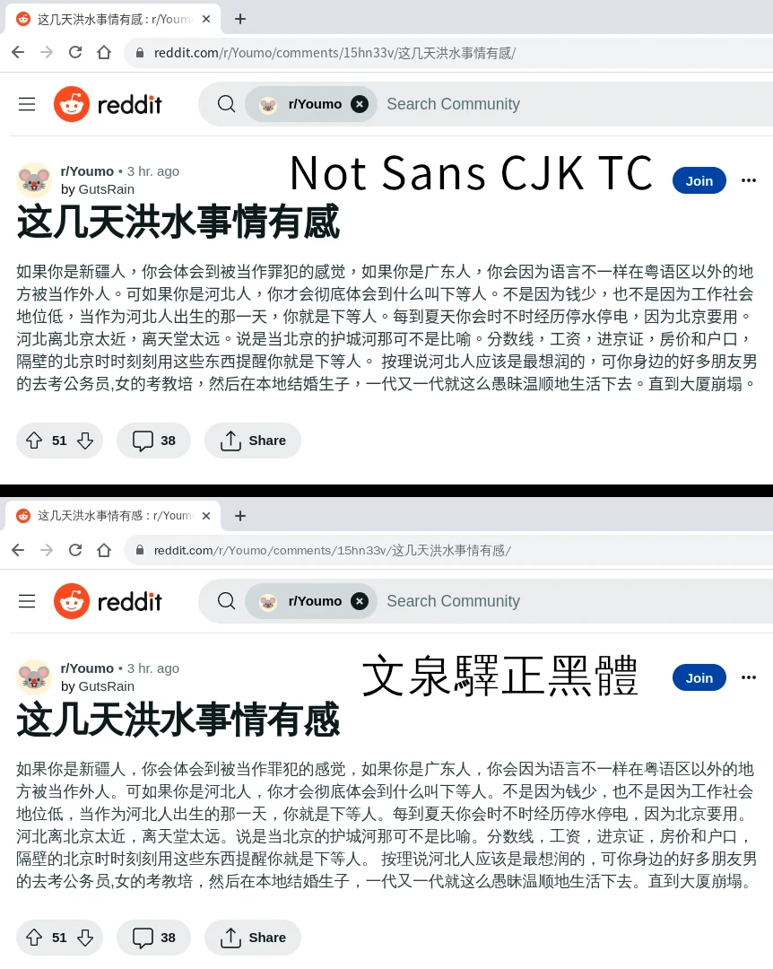 我原本是用Noto Sans CJK TC當Linux系統字型,發現Flatpak版Steam玩《Team Fortress 2》會無法顯示中文字型,裝了文泉驛正黑體才正常。可是一裝下去,Linux的中文字型優先順序就被覆蓋了,其他應用程式跟著變成採用文泉驛正黑體來顯示文字!