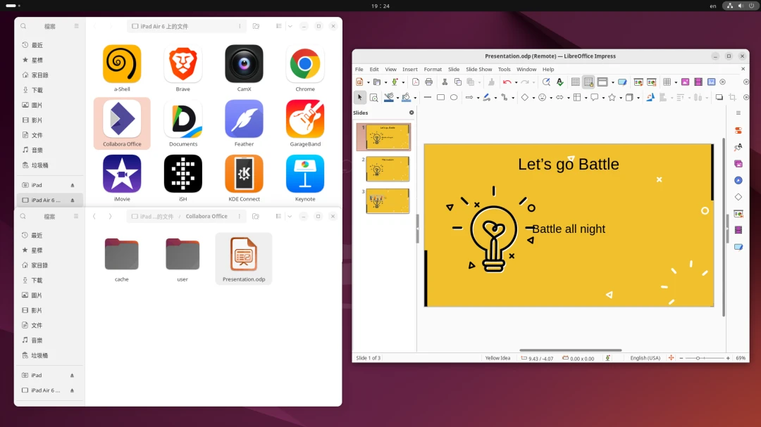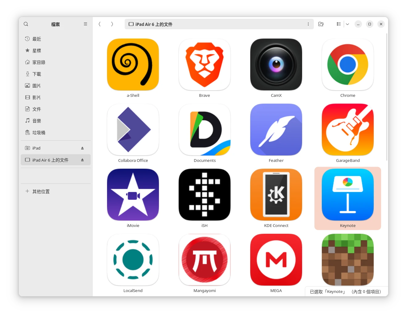 如圖,在Linux的GNOME桌面,檢視iOS的APP共享資料夾裡面的檔案,並將其傳輸到電腦。