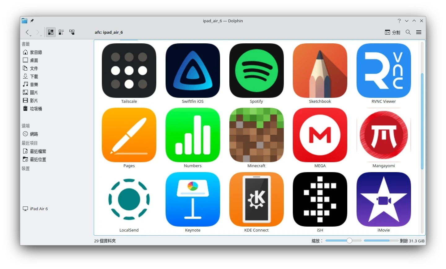 - KDE依賴kio-acp自動掛載,請安裝以下套件: