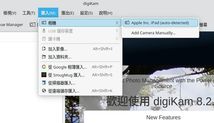 iOS裝置插上Linux電腦後會被視為一個相機裝置,所以不需要從檔案管理器手動複製,你可以利用digiKam這類照片管理程式,直接從iOS裝置匯入所有照片,進行編修。