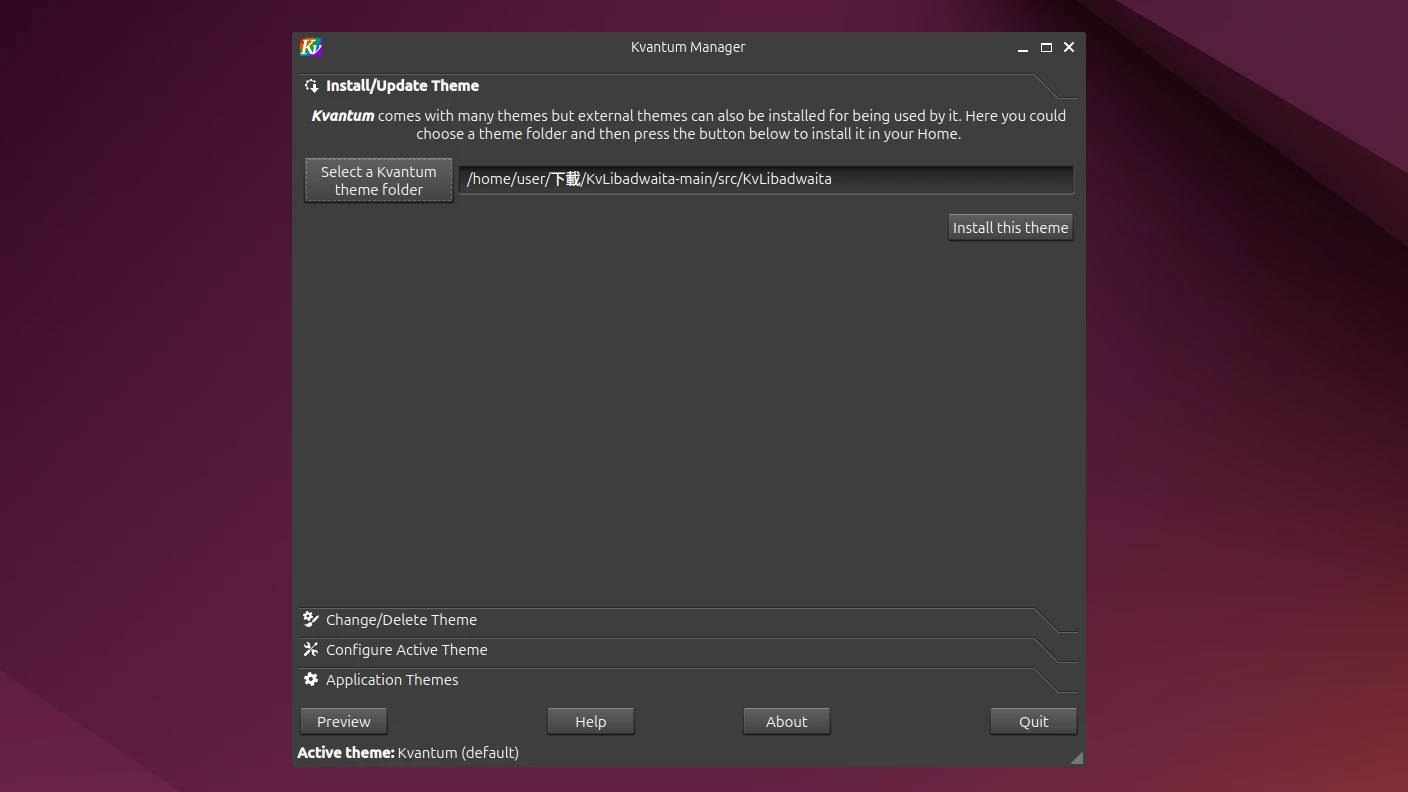 export QT_QPA_PLATFORMTHEME=qt5ct開啟Kvantum Manager,選取儲存庫主題目錄下的