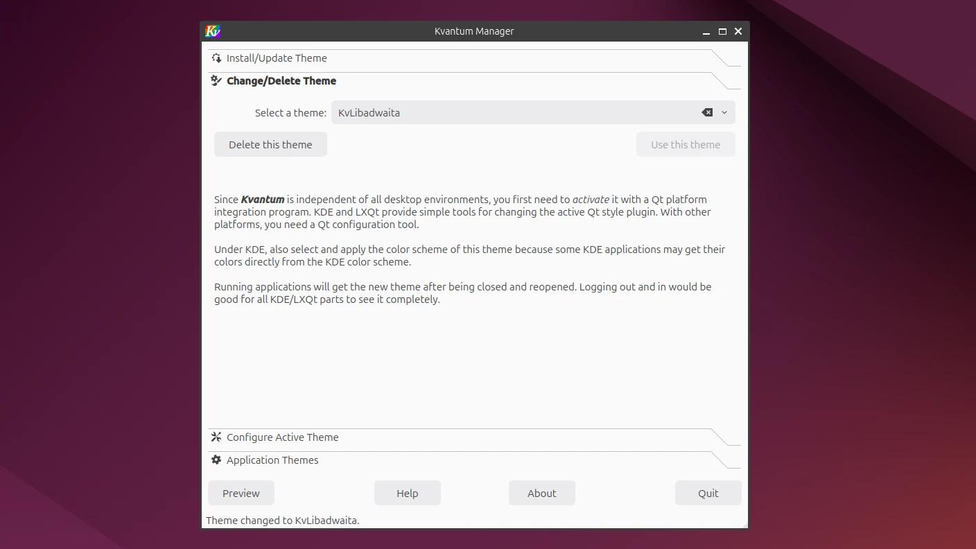 設定目前的主題為KvLibadwaita。設定檔會儲存到