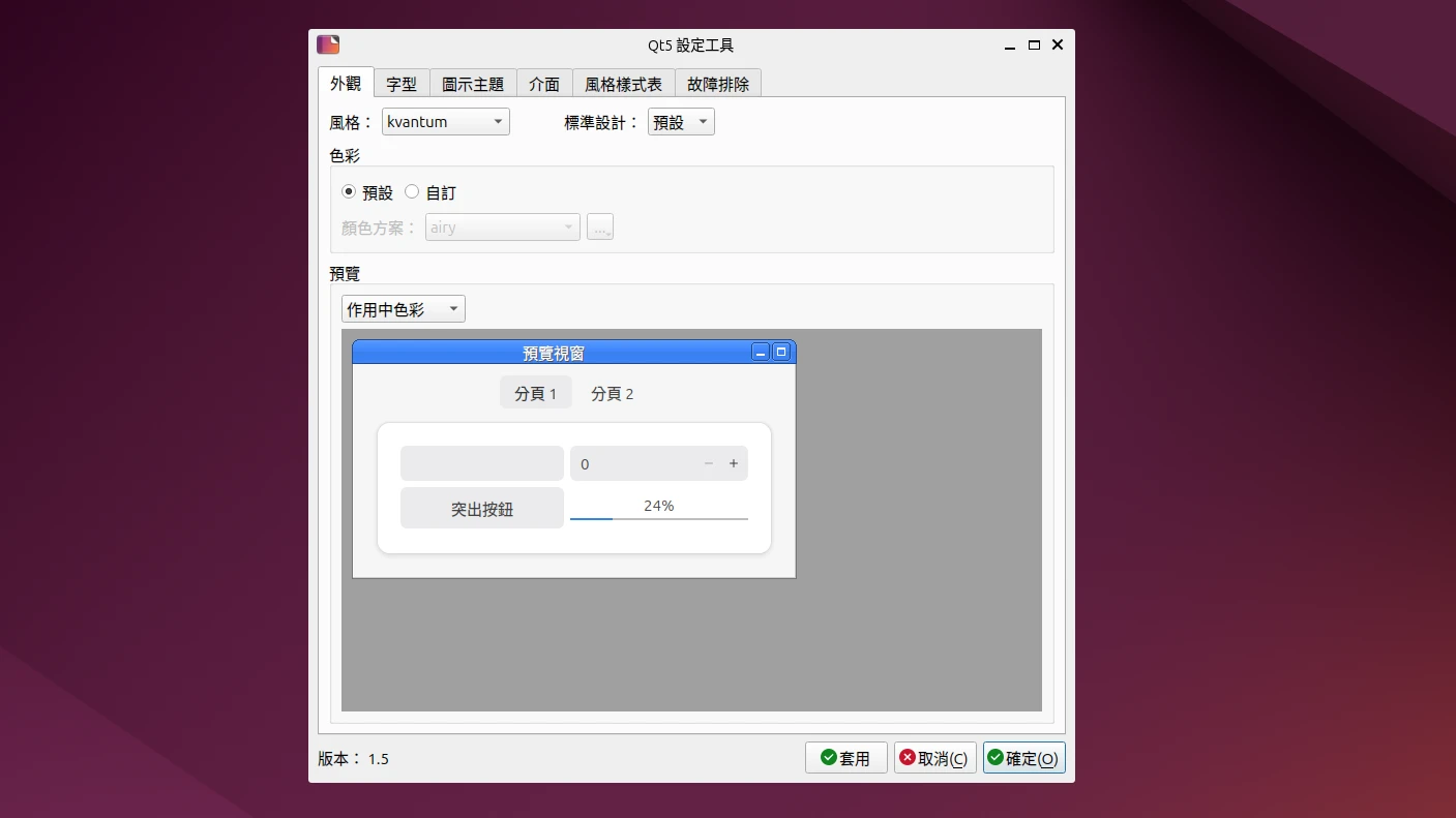 sudo apt update然後安裝Kvantum Manager。qt6-style-kvantum-themes 似乎在Ubuntu 24.04還沒建置?但不裝也沒關係。
