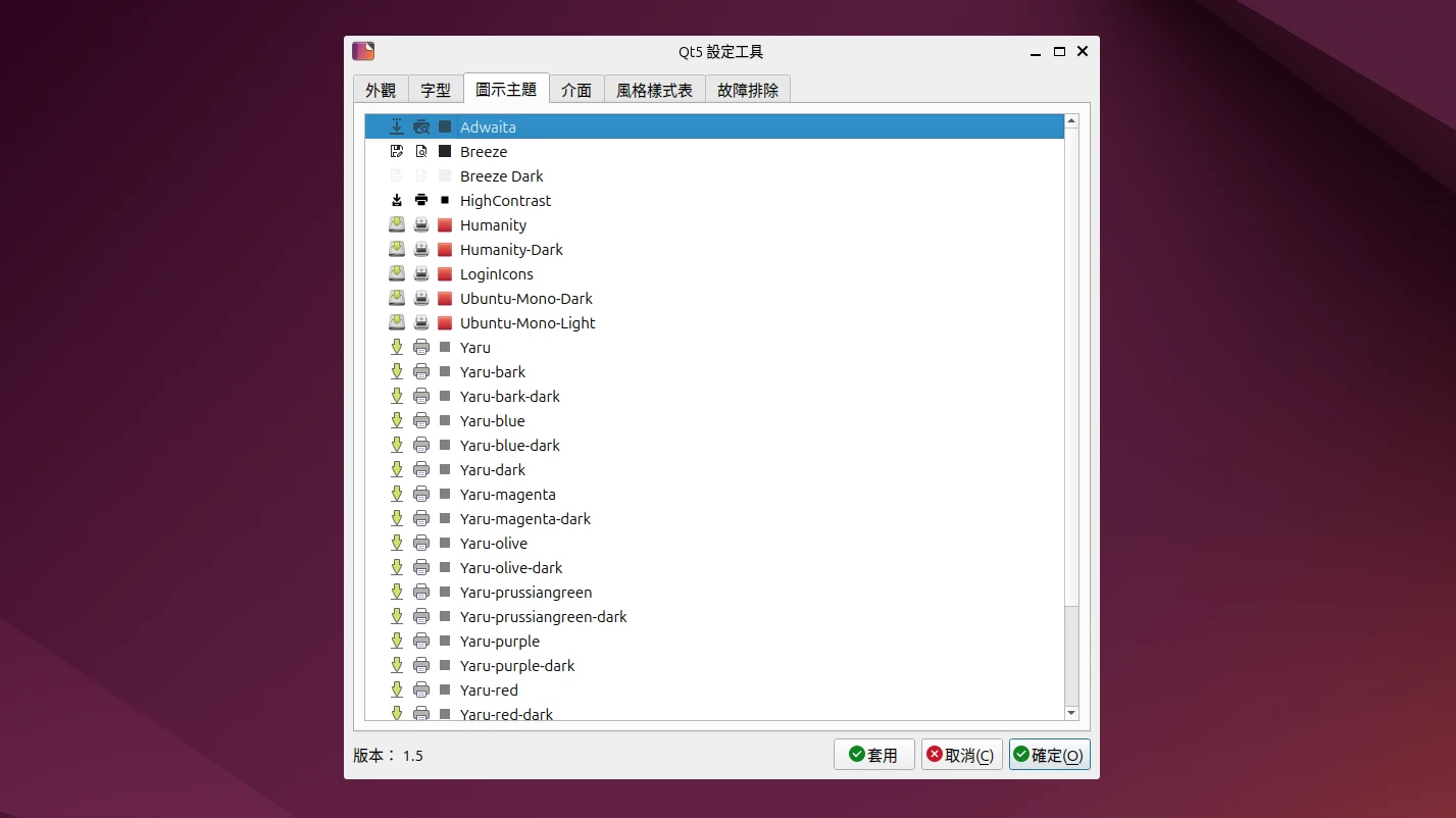 另外還要處理圖示包的問題。看是要讓QT程式使用GNOME的Adwaita,或者讓它使用KDE Breeze。Ubuntu的Yaru也可以善加利用。所以安裝以下套件: