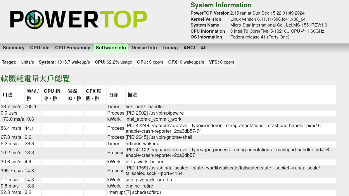 使用powertop看看哪些程式在耗電,比如瀏覽器播放影片要是沒有啟用硬體解碼,那就會額外耗電。