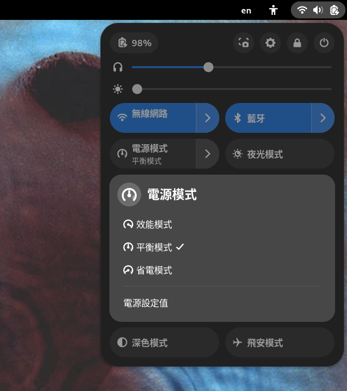 重開機,然後在桌面環境的電源選單,就會有電源模式選項。通常用「平衡」就夠了,「省電」模式會導致電腦變很卡。