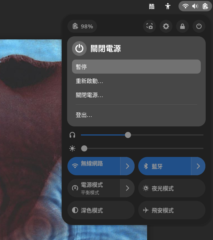 在GNOME桌面的關機選單可以看到暫停模式,背後執行的就是Suspend,效果等同執行sudo systemctl suspend指令。當你關上筆電螢幕的時候也會進入暫停模式。