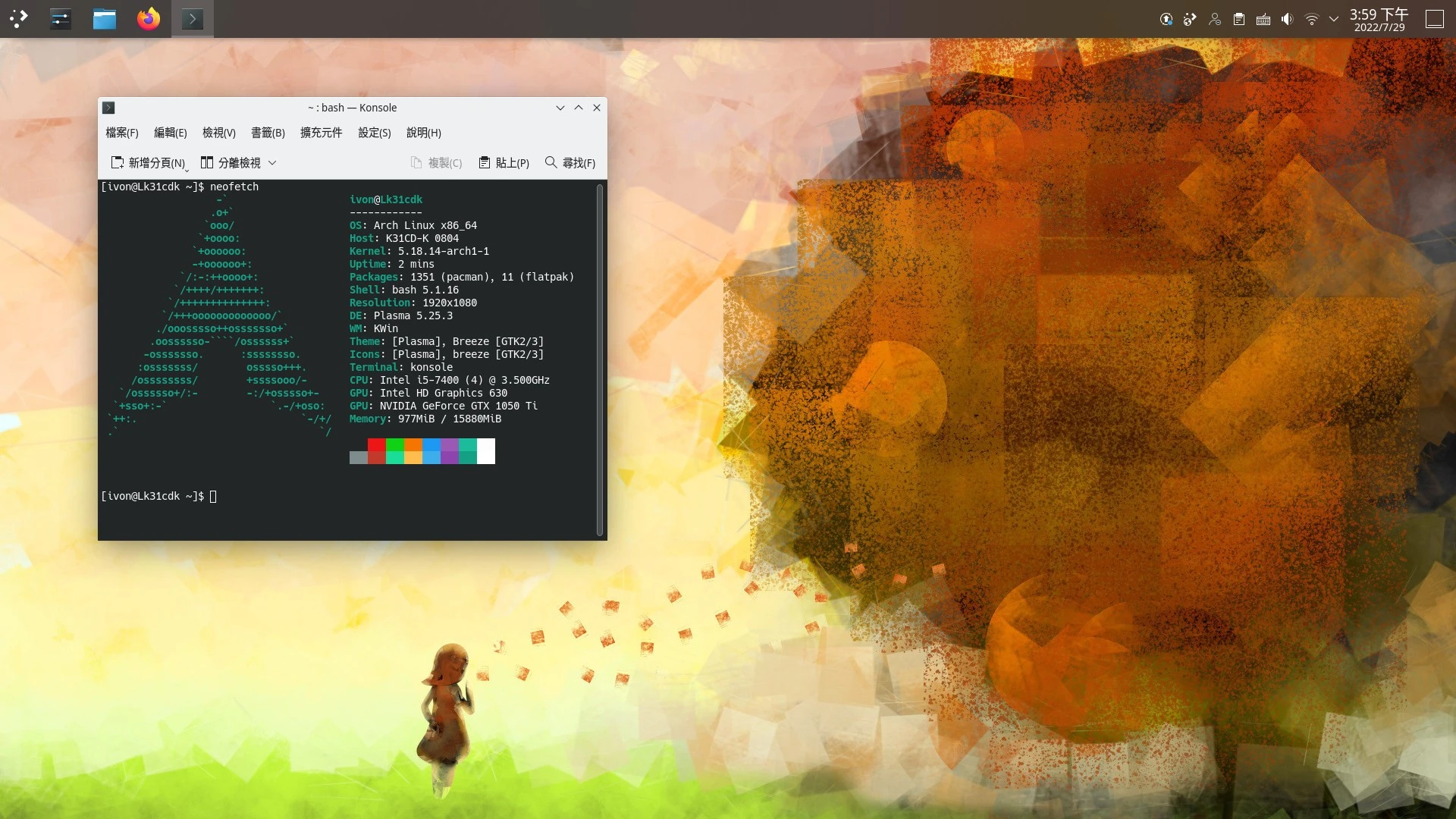 7月底,終於能夠進入Arch Linux時代,手上的二台電腦都換成Arch Linux。體會到系統套件都是最新,什麼設定都要自己來的快感。