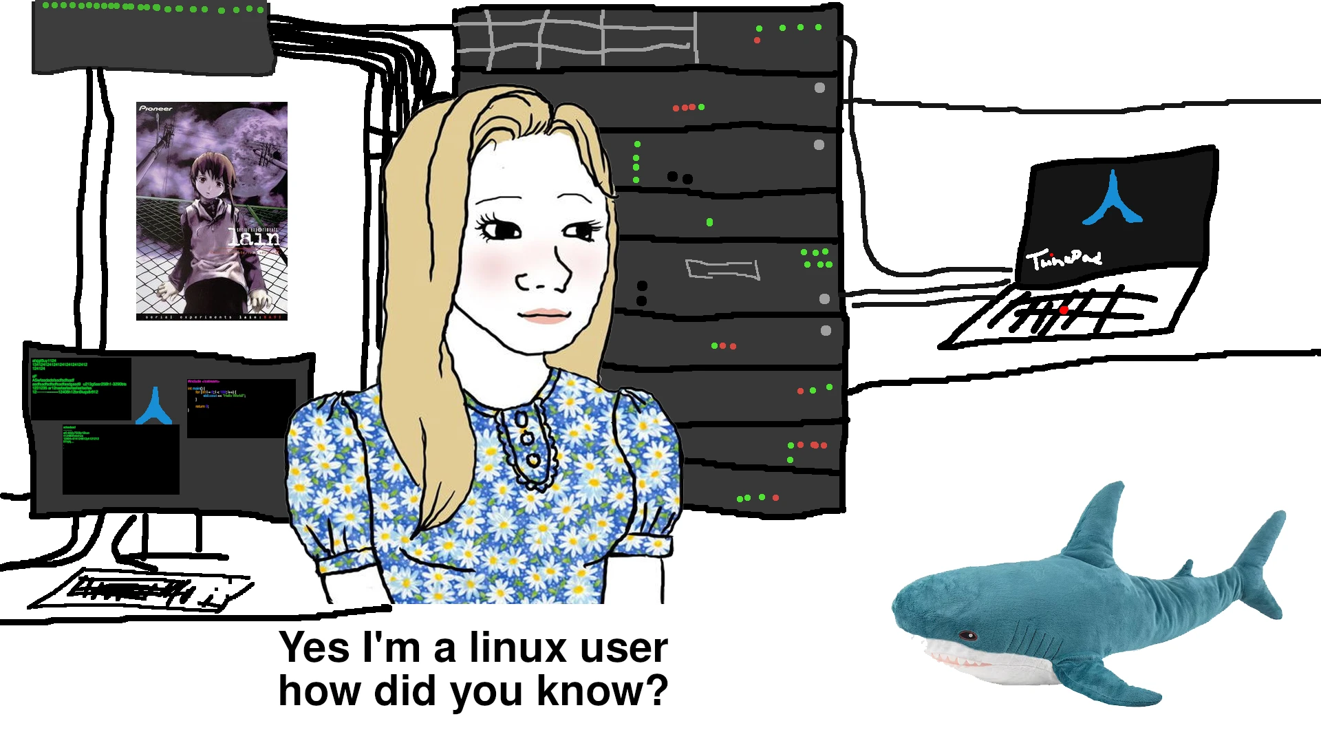 9月,研究所開學。根據觀察,英語系上課每個人都會帶自己的裝置。就裝置比例而言,無關性別,一半人使用Macbook,一半Windows,只有我是Linux。鑑於Linux硬體外觀沒什麼辨識度,所以我在筆電背蓋貼大大的Tux和Linux發行版的貼紙,穿Tux和印有FreeBSD小惡魔的衣服出門。但也就做到這種程度而已,我不會到處跟人說"I use Linux btw"。為了學分著想,上課需要的軟體不支援Linux我也不太敢跟教授靠北,而是用虛擬機解決,或是在許可下用odt取代docx交作業。大多數時候沒人會care你用什麼系統的。僅有一次,遇過博士生看我打指令覺得很好奇,真是尷尬。