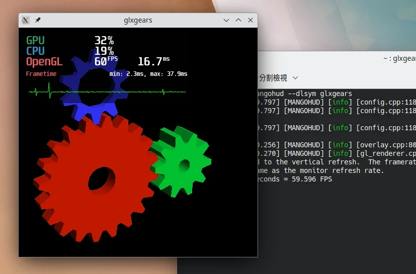 MangoHud預設只能在使用Vulkan的應用程式執行,若程式使用OpenGL執行的話要額外加上參數。