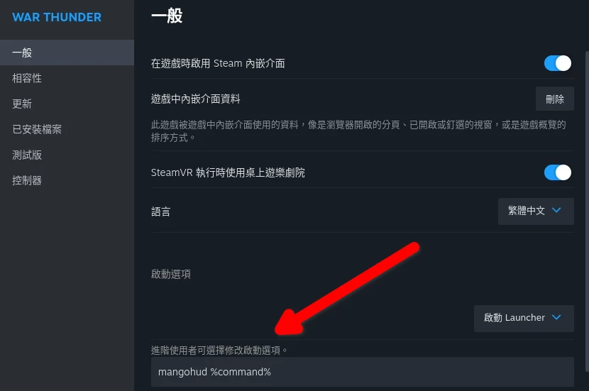 MANGOHUD=1,給Steam全部遊戲啟用MangoHud。有些程式只要設定這一步驟MangoHud就會跑出來,不需要再進一步設定。您也可以改為設定MANGOHUD=0,這樣它就不會全域啟用,而是僅加入mangohud指令的遊戲才啟動