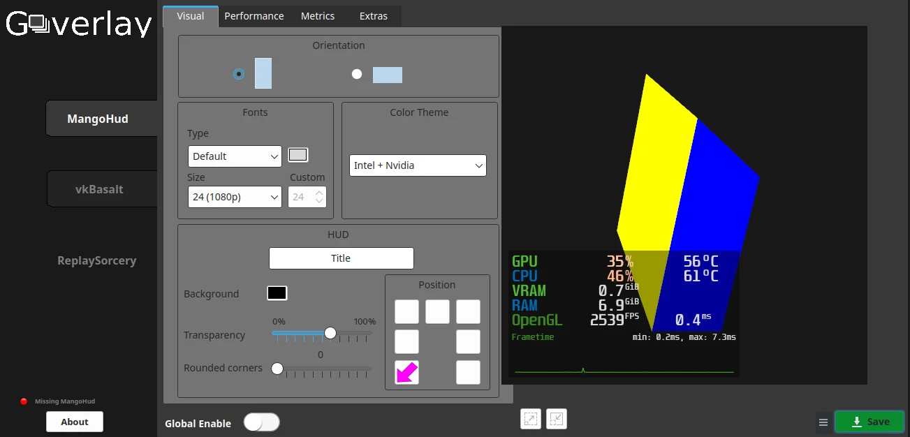 Goverlay是另一名開發者Benjamim Gois製作的軟體,可用圖形界面編輯MangoHud的設定檔,修改版面配置。